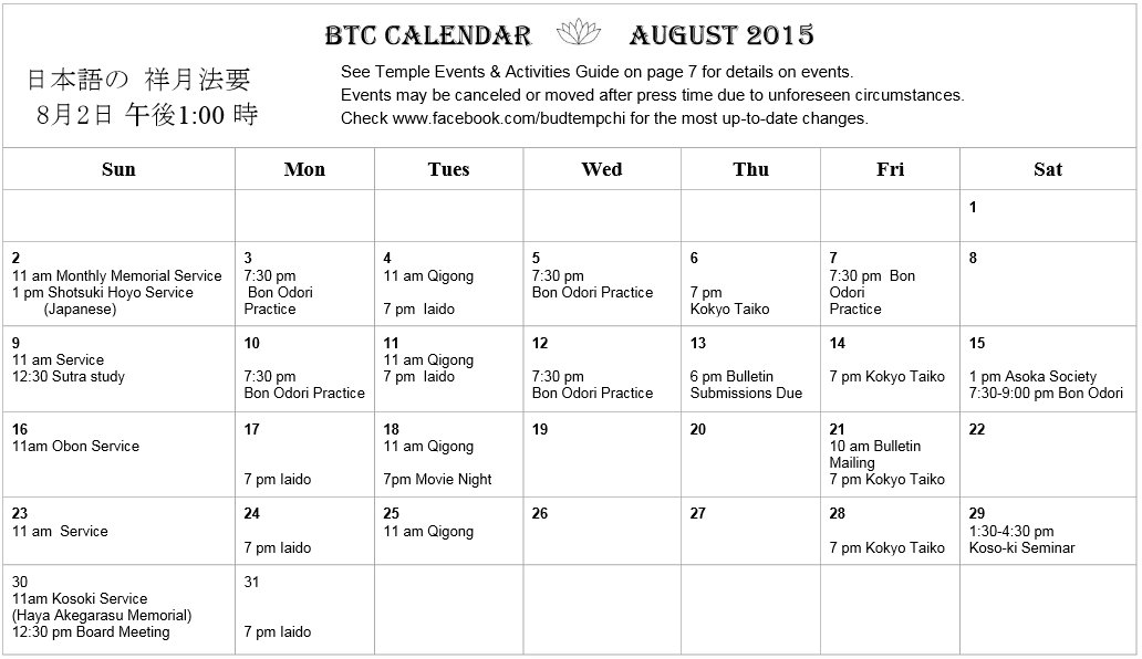 August 2015 Calendar July 27, 2015 Click calendar to see a larger version. Note: Many groups are on summer hiatus. Share this: Click to email a link to a friend (Opens in new window) Email Click to share on Facebook (Opens in new window) Facebook Click to share on X (Opens in new window) X