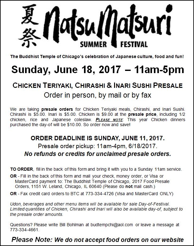 June 2017 Bulletin May 22, 2017 BTC Bulletin, June 2017 | June Memorial | April Acknowledgements | Natsu Matsuri flyer | Natsu Matsuri chicken teriyaki/chirashi/inari sushi pre-sale form Click here for the archives. Share this: Click to email a link to a friend (Opens in new window) Email Click to share on Facebook (Opens in new window) Facebook Click to share on X (Opens in new window) X