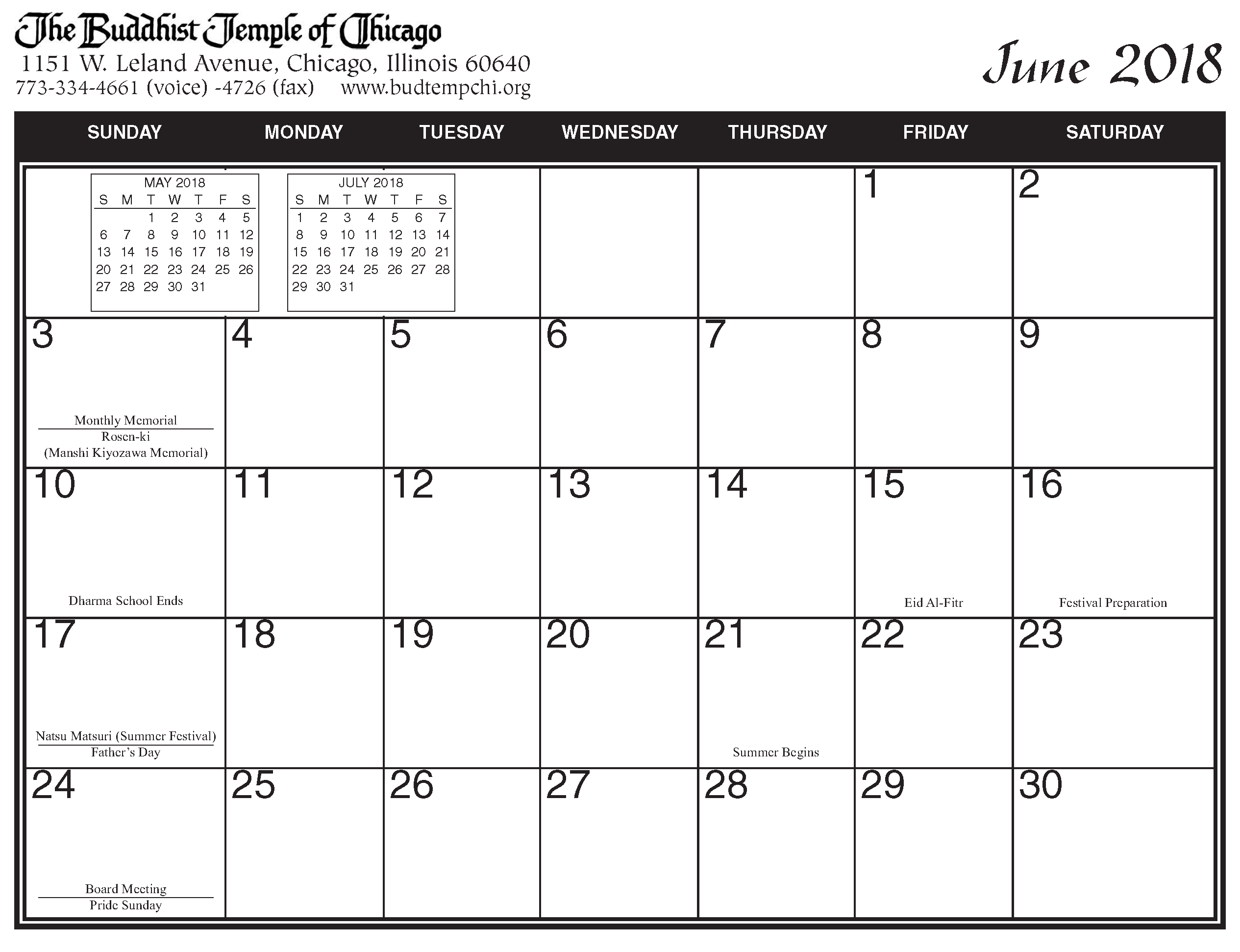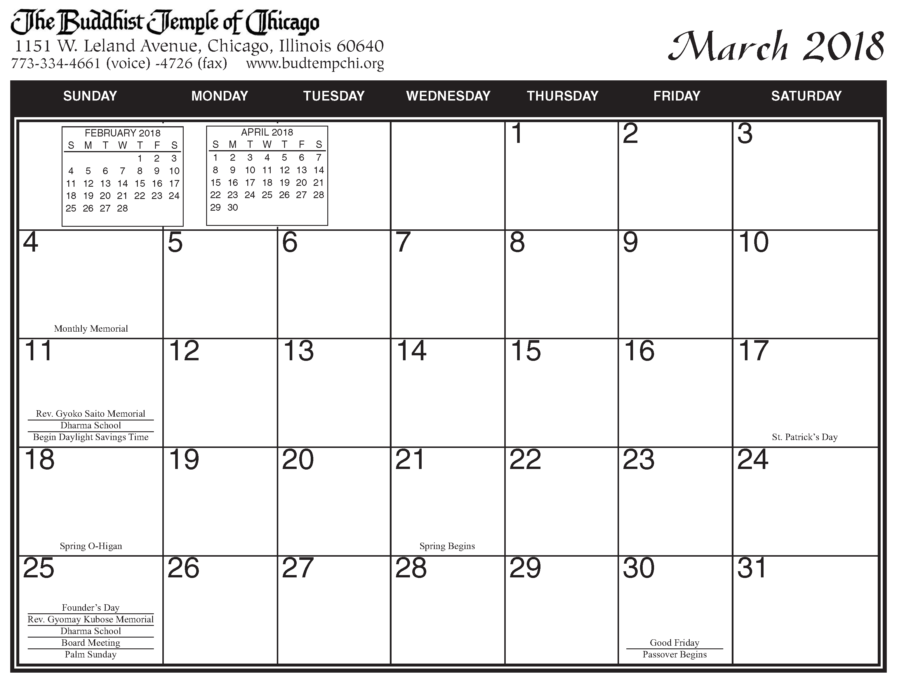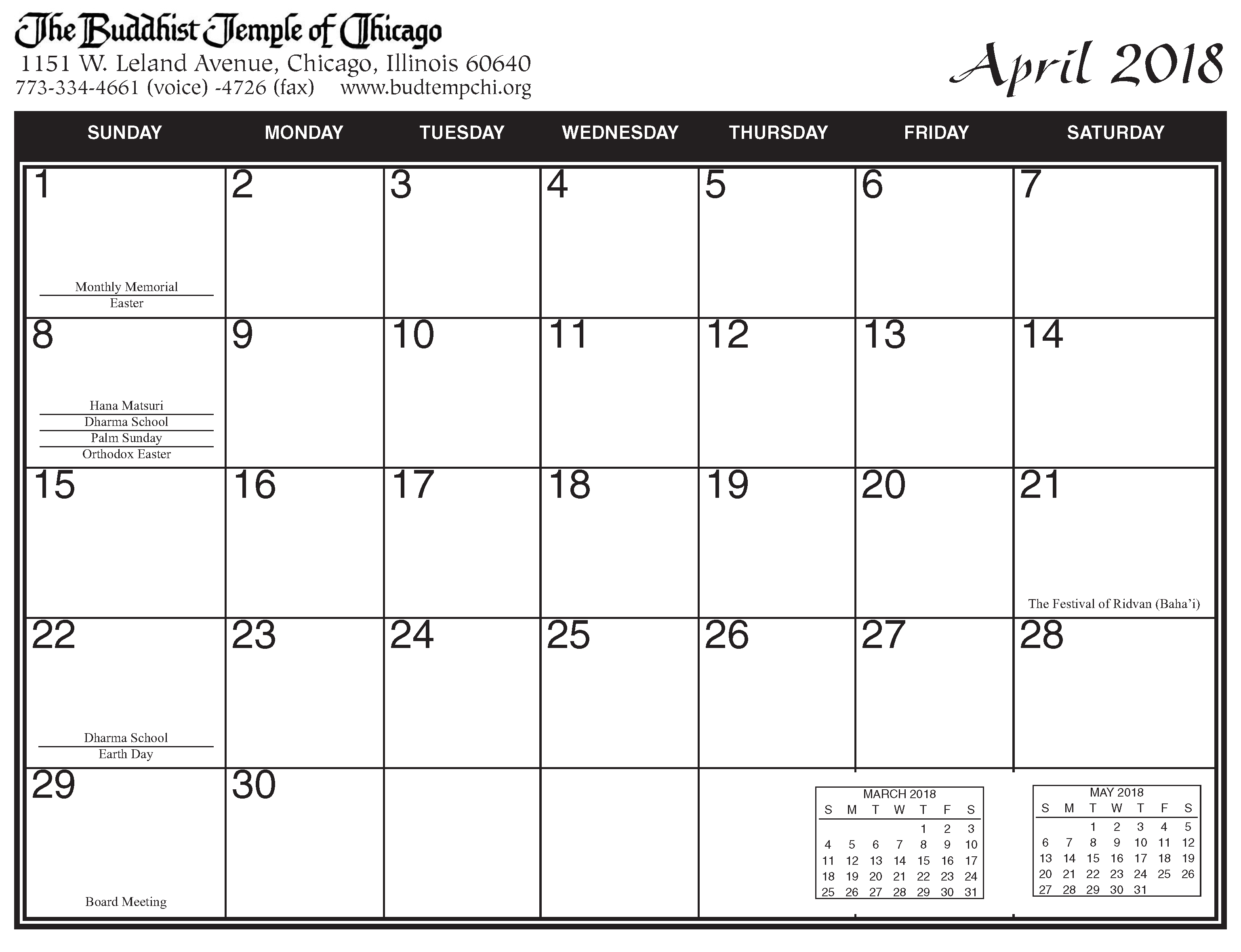 This printed calendar is provided online for those who need more than a month’s notice on certain special annual events and holidays. Because this calendar was published in December of 2017, please note that it does not include classes and is always at risk of being outdated, especially as we get later into the year. Check Facebook and the current calendar page (updated monthly for the BTC Bulletin) for the most recent dates.