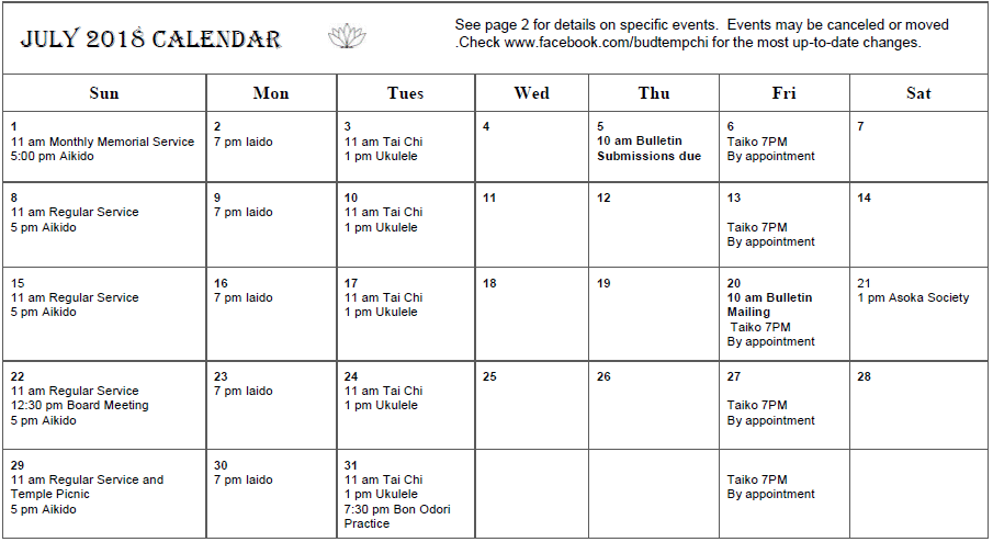 Reminders: Third quarter membership fees are due! (Of course, you can make donations at any time.) Also, note that many groups are on limited summer hours or summer break, so please check the most recent calendar and Facebook for updates. The temple will be closed Labor Day weekend.