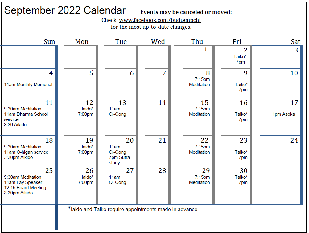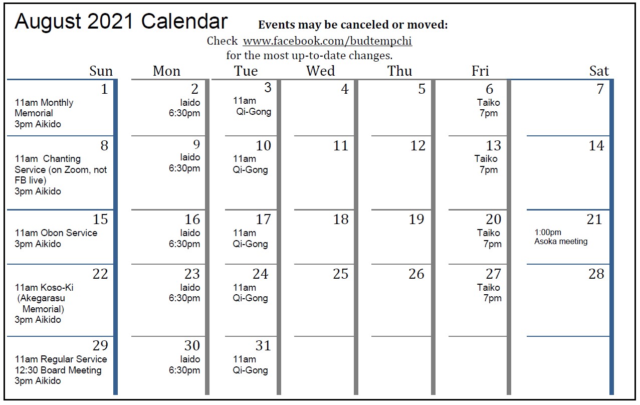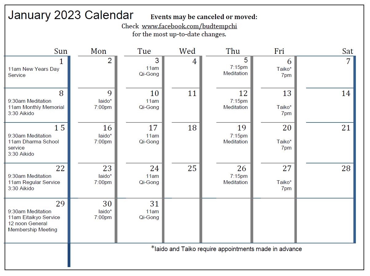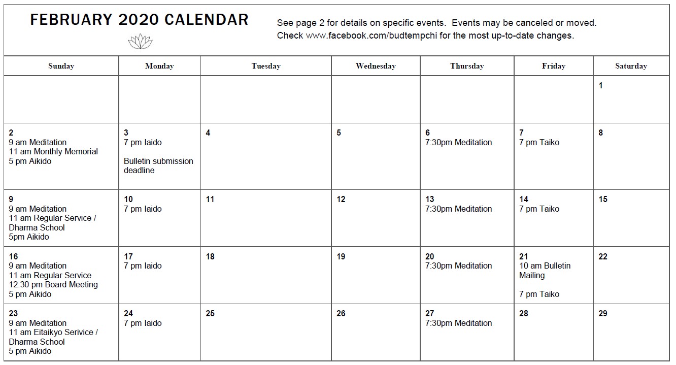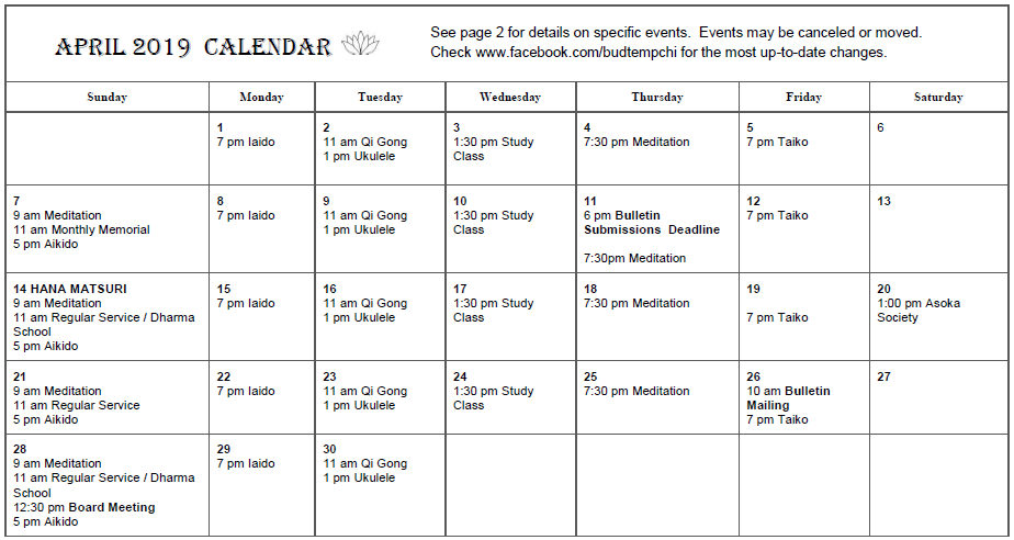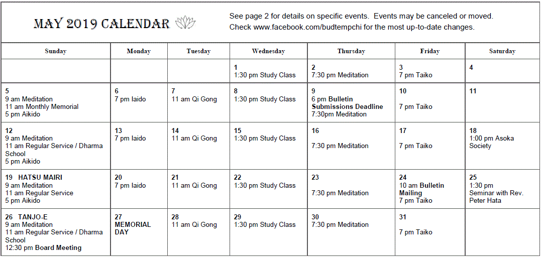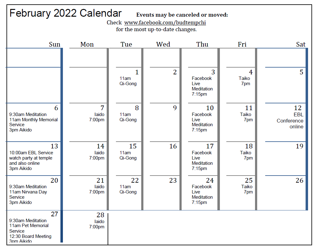 This printed calendar is provided online for those who need more than a month’s notice on certain special annual events and holidays. Please note that it is subject to last-minute changes, additions, and cancellations, so please check Facebook and the current calendar page (updated monthly for the BTC Bulletin) for the most recent dates.