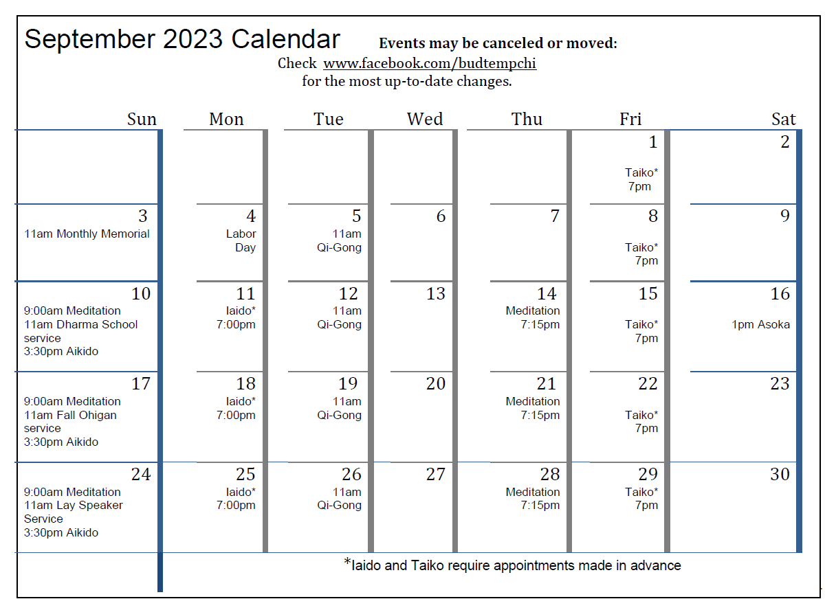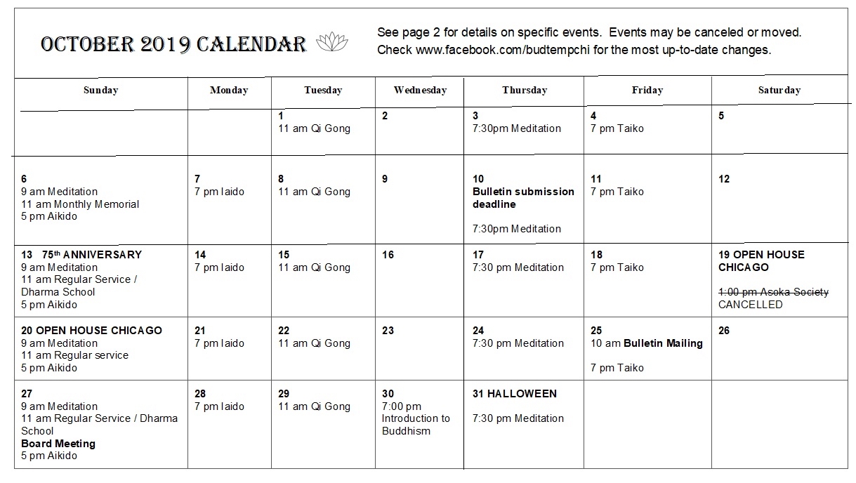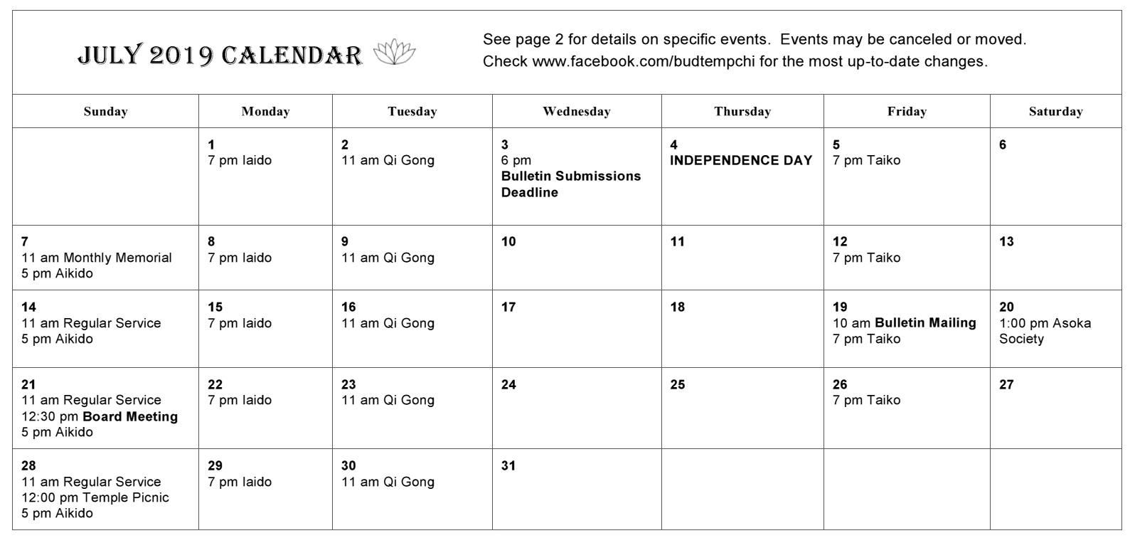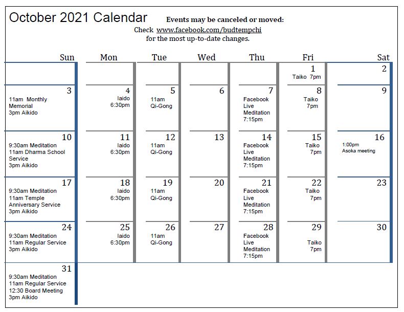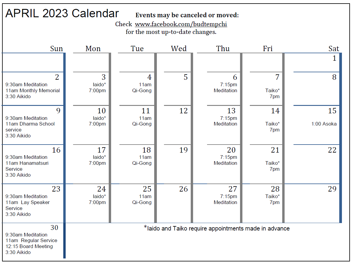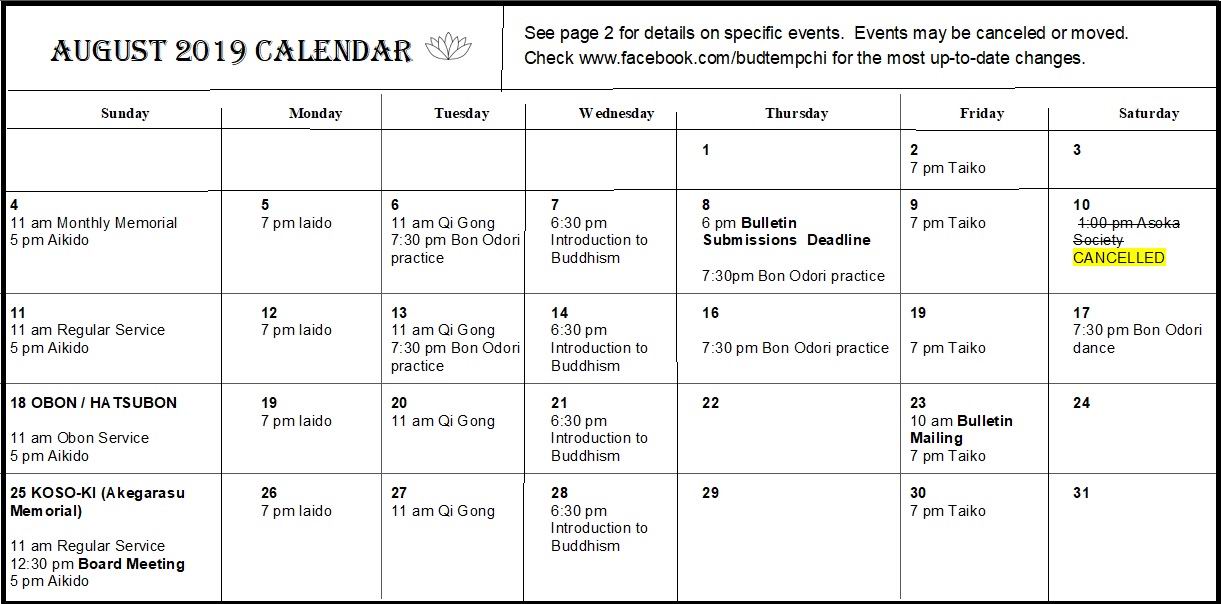 This printed calendar is provided online for those who need more than a month’s notice on certain special annual events and holidays. Please note that it is subject to last-minute changes, additions, and cancellations, so please check Facebook and the current calendar page (updated monthly for the BTC Bulletin) for the most recent dates.