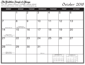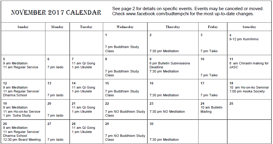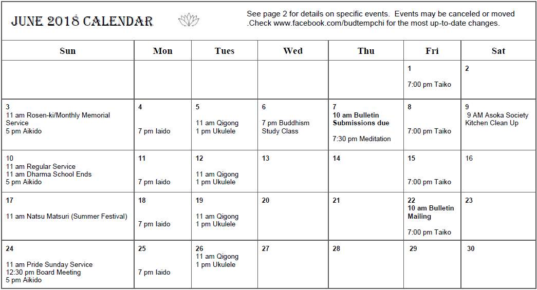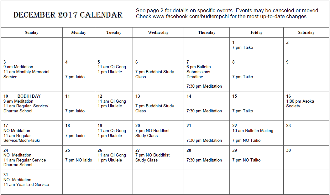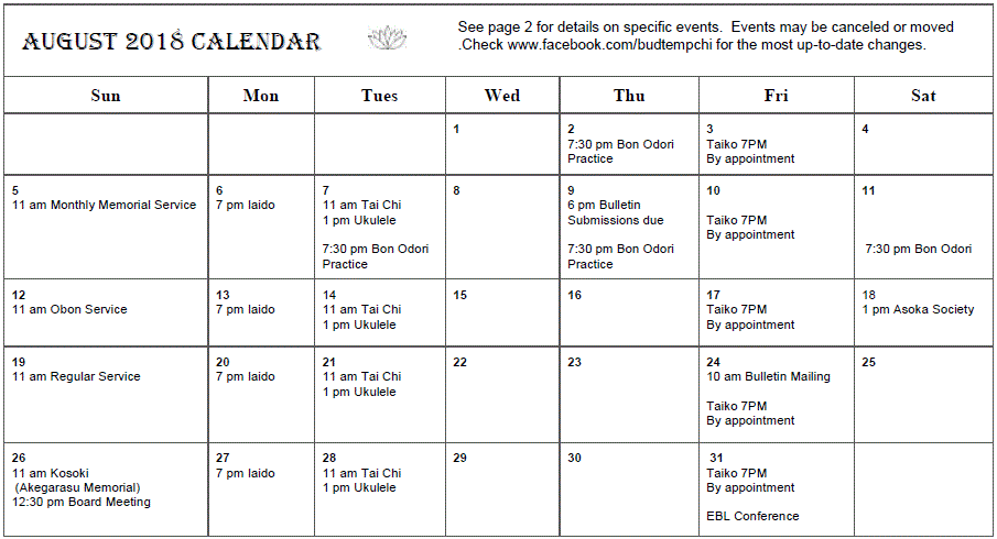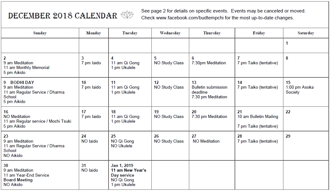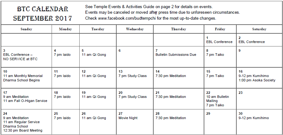 This printed calendar is provided online for those who need more than a month’s notice on certain special annual events and holidays. Please note that it is subject to last-minute changes, additions, and cancellations, so please check Facebook and the current calendar page (updated monthly for the BTC Bulletin) for the most recent dates.